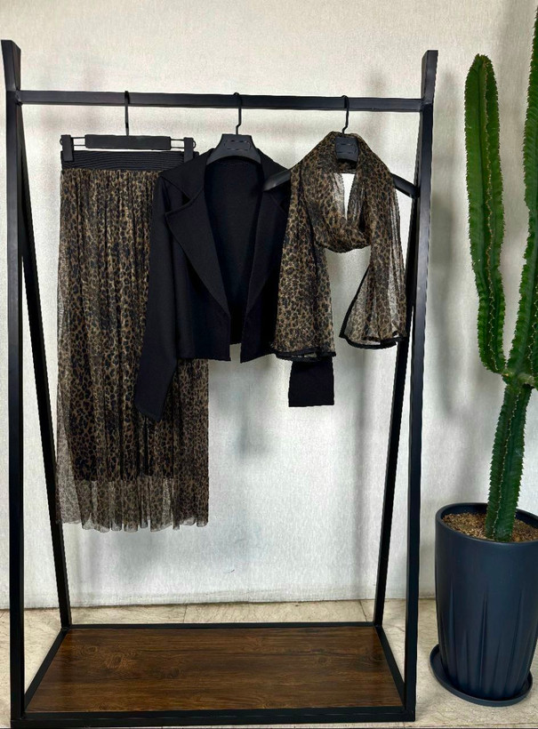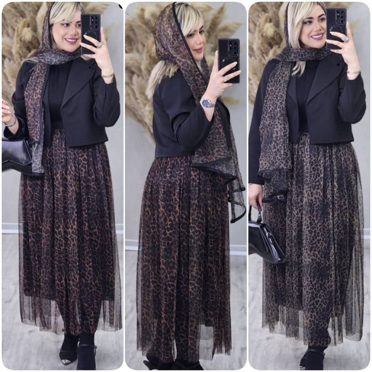 توضیحات: 🌹🌹ست سه تیکه کت و دامن و شال🌹🌹 🍃💕نام : ست* سه تیکه* ترلان ❤️جنس : مازراتی، تور ❤️ پلنگی نسکافه ای ❤️سایز ها : فری38_46