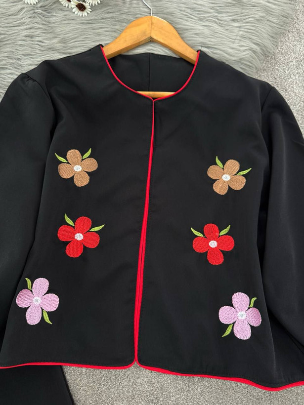 سایر توضیحات: 👚قد کت 49 دور سینه 112 قد آستین از یقه 67 دور بازو 38 دور مچ 30 گلدوزی شده✅ پشت کار گلدوزی ✅️ حاشیه کار نوار دوزی شده✅️