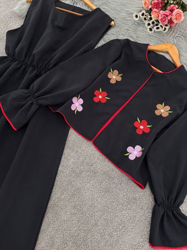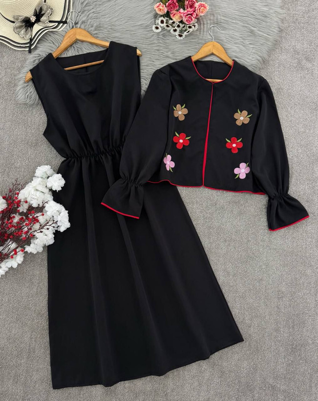 توضیحات: 🍃💕نام : کت و سارافون گلدوزی نیایش جنس : مازراتی رنگ بندی : مشکی سایز ها : فری سایز