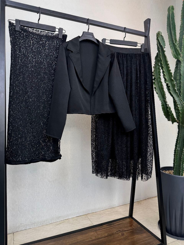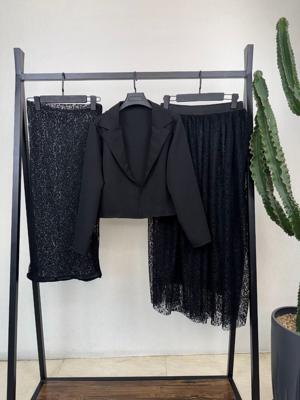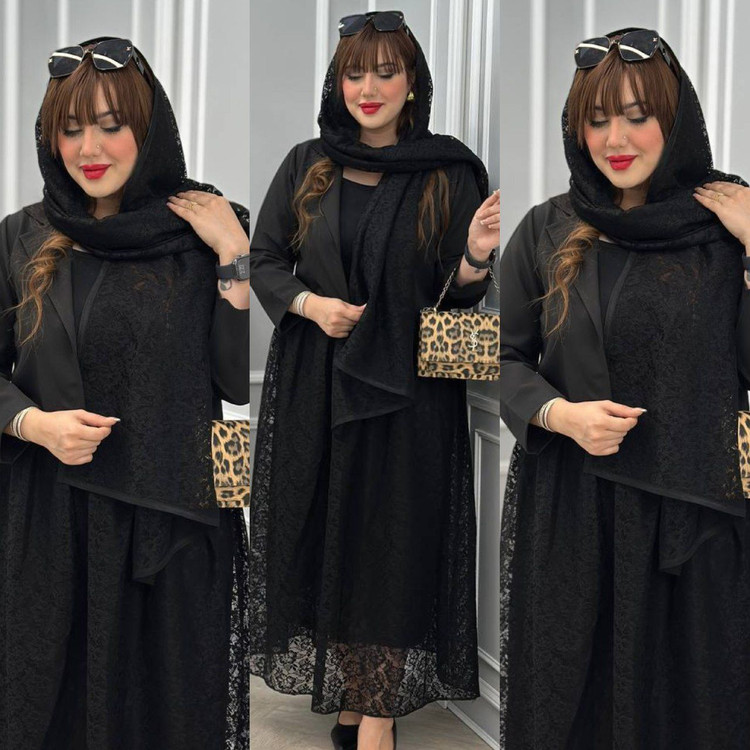 توضیحات: 💞نام : سه تیکه نیایش 💞جنس : مازراتی و گیپور دانتل 💞رنگ بندی : مشکی 💞سایز ها : فری38_46