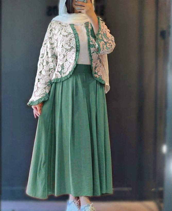 🗒️توضیحات :رویه کت گیپور دانتل اصلی استفاده شده، پشت کت شانتون ساده ست، جلوی کت با بندینک بسته میشه. پشت کمر دامن کش خورده، پل کمر نداره.طرح گیپور رندومه